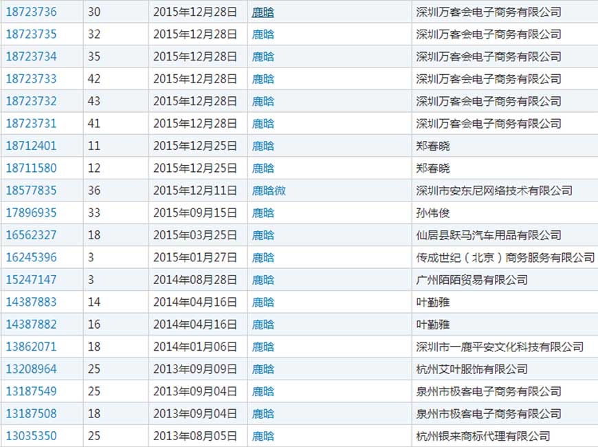 小編通過(guò)檢索發(fā)現,目前共有47件“鹿晗”或者包含“鹿晗”的商標申請,從這些申請人中有個(gè)“南京鹿晗影視文化工作室”申請人,通過(guò)查詢(xún)了解到這個(gè)是鹿晗所屬工作室,鹿晗的很多官方信息都是這個(gè)工作室發(fā)布的。最早商標申請日為2013年8月5日。而最早申請這個(gè)商標的申請人并不是“南京鹿晗影視文化工作室”。那說(shuō)明“鹿晗”這個(gè)商標早就被人搶注了。
