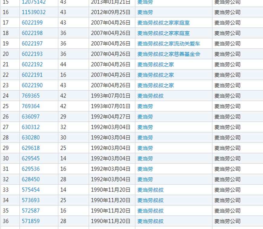 根據商標局查詢(xún)到結果,這“金拱門(mén)”商標共有3個(gè),并且都不是中信凱雷申請的,也不是麥當勞申請的。而此前“麥當勞”商標檢索到84個(gè)商標,最早能追溯到1989年申請的商標。都是由麥當勞公司申請的。
